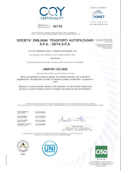 SETA ha avviato il percorso per il conseguimento della certificazione nel luglio 2024, con l'istituzione del Comitato Guida per la Parità di Genere, cui è stato affidato il compito di promuovere e garantire l'eguaglianza di genere all'interno dell'azienda, definendo obiettivi e piani strategici per sostenere e diffondere la cultura della non discriminazione e dell'inclusione, e per valorizzare le diversità, garantire pari opportunità ed equità retributiva, favorire il work-life balance e creare un ambiente di lavoro equo e rispettoso per tutti i dipendenti.