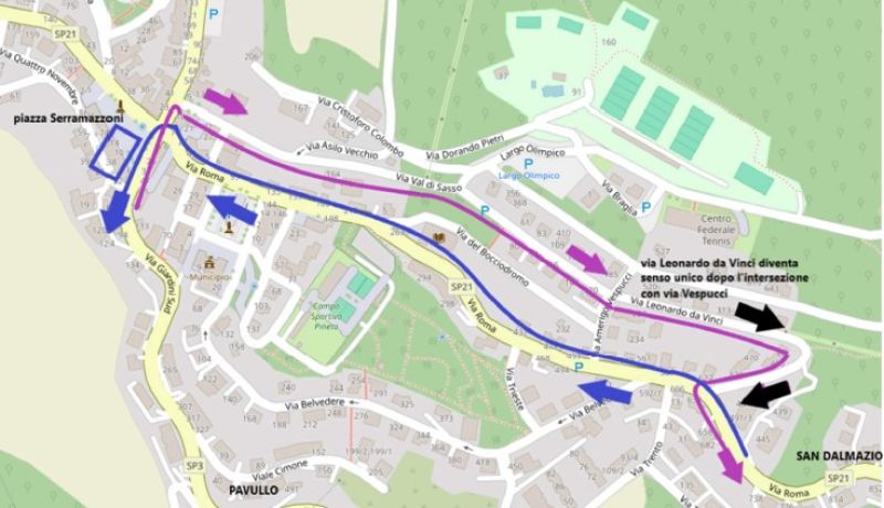 Linea 745 direzione San Dalmazio/Vignola: effettuata la fermata di Serramazzoni percorre via Giardini in direzione Modena poi via Val di Sasso, via Leonardo da Vinci, via Roma poi percorso regolare. In direzione Serramazzoni: percorso regolare.