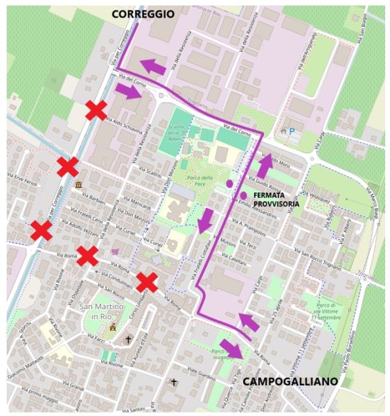 A San Martino in Rio, causa lavori stradali, è disposta la chiusura parziale al traffico di Via Roma: da lunedì 6 ottobre e fino al ripristino della normale viabilità la linea extraurbana 550 effettua la seguente modifica di percorso: in direzione Correggio percorre via Roma, via Fratelli Cottafavi, via del Corno, via per Correggio poi percorso regolare; percorso inverso in direzione Campogalliano.
