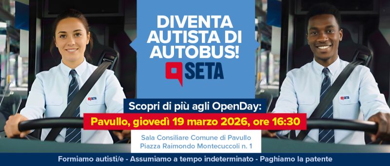SETA ha avviato una selezione per autisti e autiste di autobus, aperta a candidati/e con più di 20 anni. L'Academy SETA formerà i candidati e le candidate, consentendo loro di acquisire le certificazioni necessarie all'esercizio della professione: patente D e certificato CQC persone (Carta di Qualificazione del Conducente).