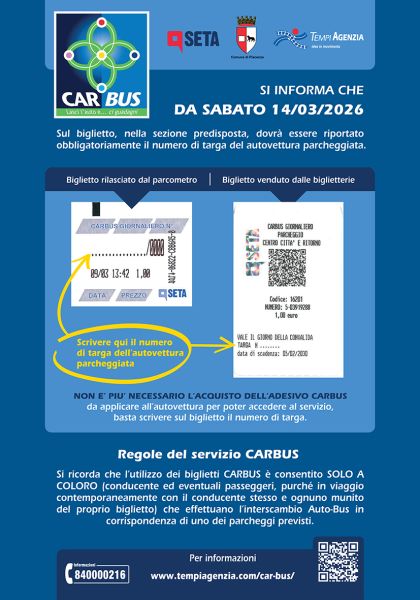 Da sabato 14 marzo per poter accedere al servizio Car Bus non è più necessario l'acquisto dell'adesivo da applicare all'autovettura: sui biglietti rilasciati dal parcometro o acquistati nelle biglietterie dovrà essere riportato obbligatoriamente, nella sezione predisposta e prima di salire a bordo, il numero di targa dell'autovettura parcheggiata. Tale procedura consentirà di dimostrare leffettivo interscambio autovettura-bus in caso di verifica.